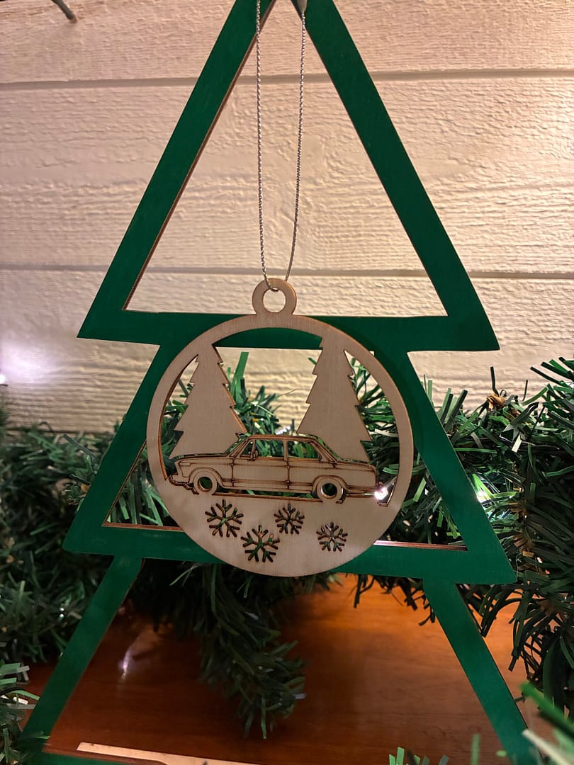 Tillverkad i 3mm trä, 80mm i diameter, levereras med upphängnings-snöre.