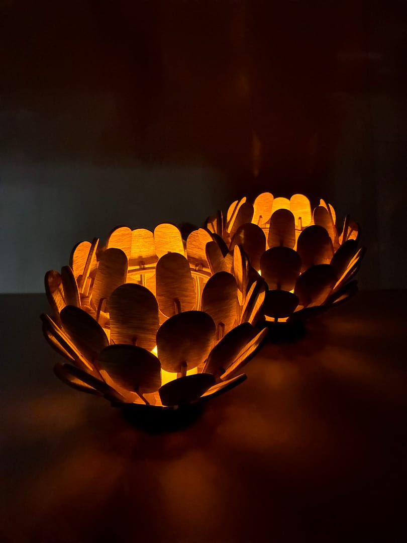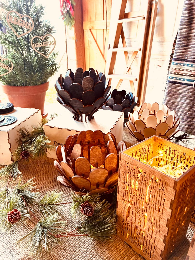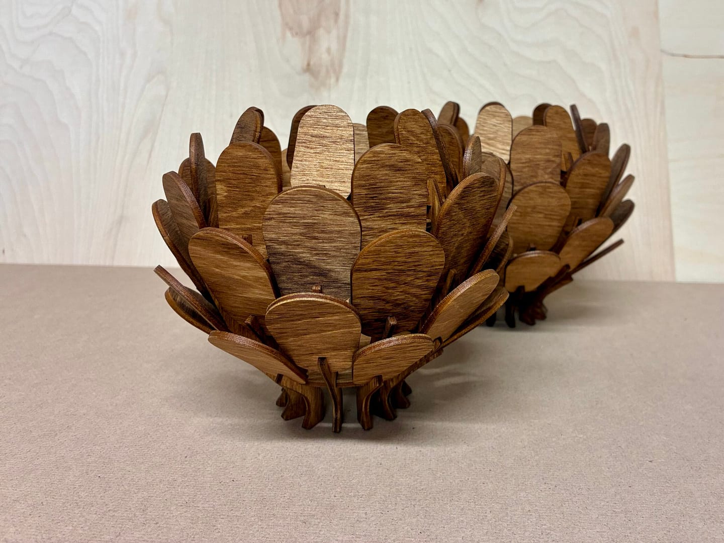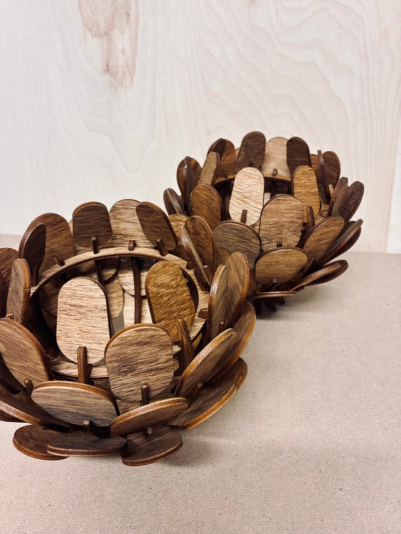 Skärs ut i 3mm björkplywood som sedan betsas i den färg som önskas.